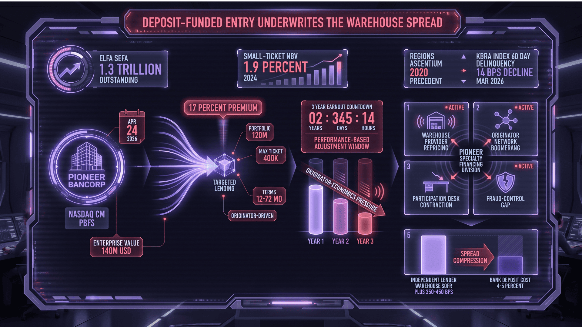 What is not in the press release. Three material questions are not answered by the announcement: whether forward-flow commitments accompany the platform purchase, whether Targeted Lending's originator network is contractually retained or open to recruitment during integration, and what the credit-quality profile of the $120 million portfolio looks like (delinquency rates, loss rates, average ticket, geographic and industry mix).1 Each gap shapes the competitive timeline. Pioneer's eventual 8-K filing will be the operative disclosure to watch through Q3 2026, and the integration tracking will determine whether warehouse repricing arrives in the first six months or the second six.